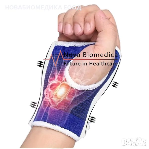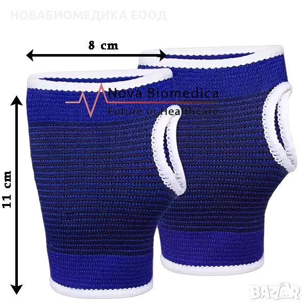 Еластичния накитник за фиксиране на китката е изработен от здарва и еластична тъкан. Има специялен отвор за палеца, което у позволява да се фиксира добре за китката. Леко затопля и се проветрява добре – не запарва.