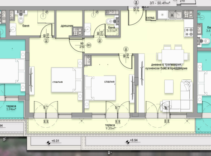 Разпределението на имота се състои от входно антре , 2 бани с тоалетни, дневна с кухненски бокс, и две спални и тераса.
