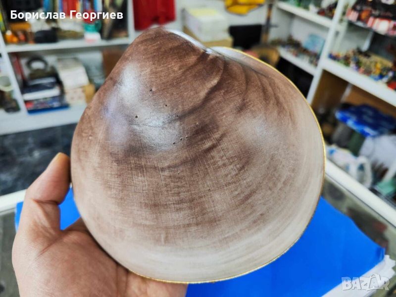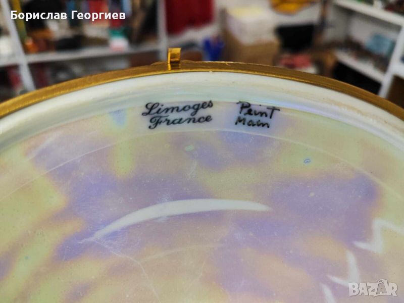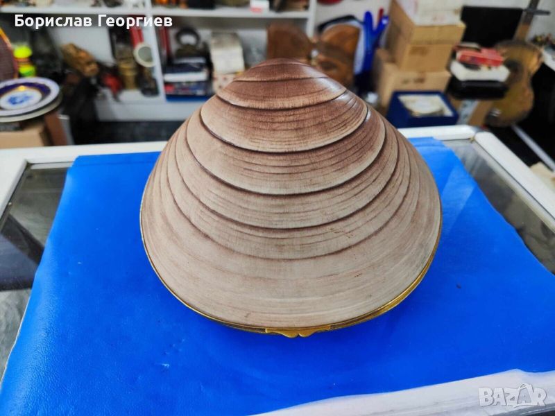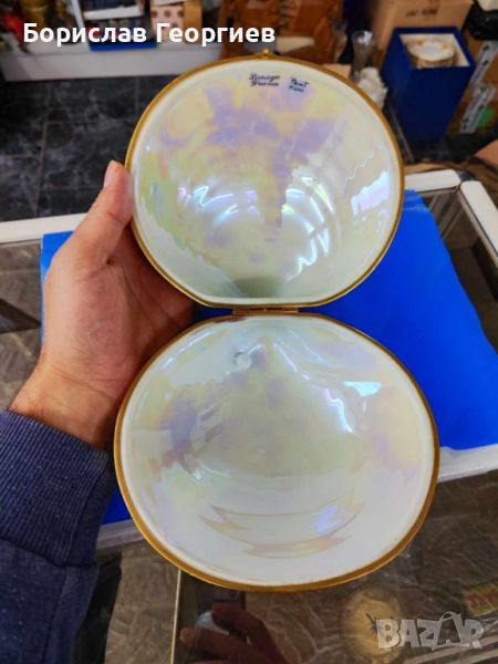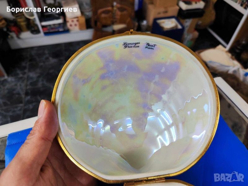 порцеланова кутия с форма на мида, произведена във Франция от Лимож. Интересният размер и форма биха украсили всяка масичка за кафе, скрин или тоалетна. Палитрата е реалистична, което я прави много естествено изглеждащ аксесоар с интериор, декориран със седефено покритие и прикрепена перла вътре.
