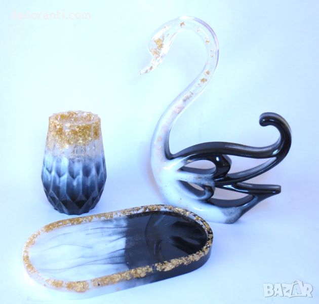 Комплект от 3 части. Лебед 22см./18см., подложка 18см./10см., вазичка 10см./8см. Опаковани красиво в кутия.