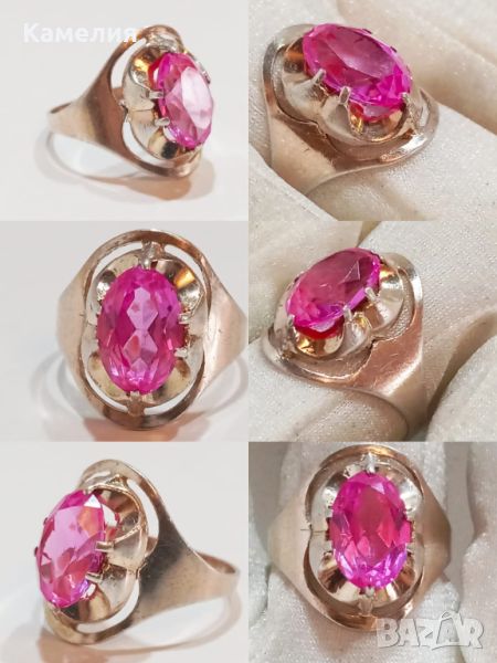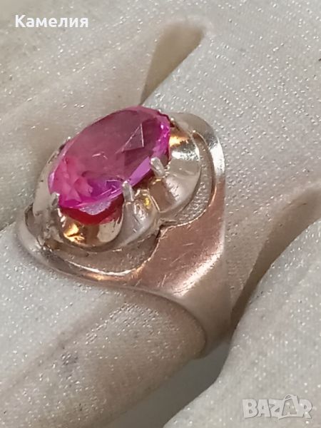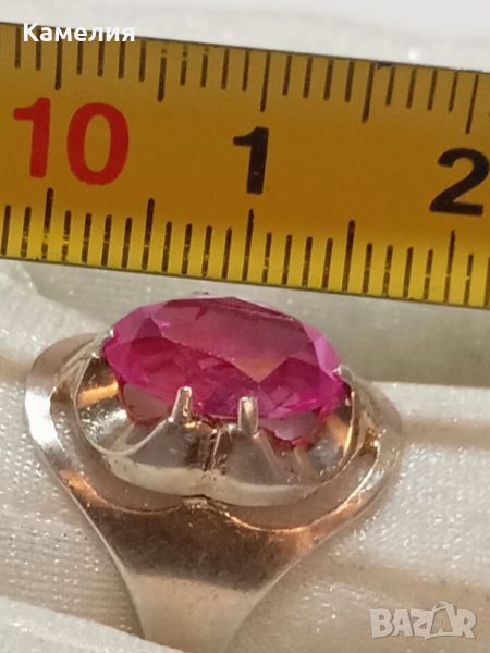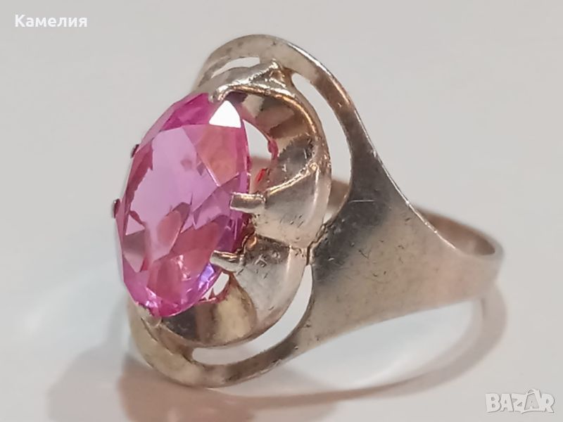 Руски ( съветски) сребърен позлатен винтидж пръстен Паяк. Проба звезда 875. 4,82 грам. Диаметр 19 -19,5 мм. Камък синтетичен корунд цвят розов.