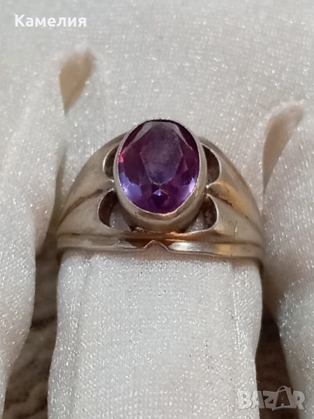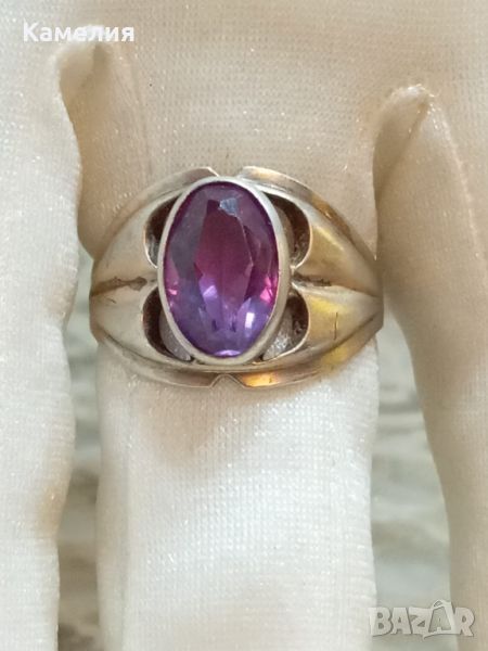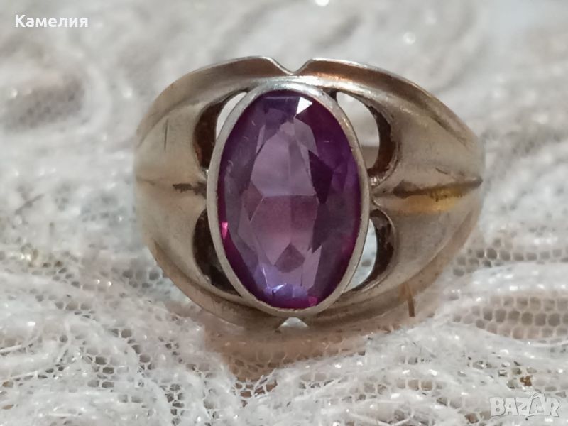Камък синтетичен корунд цвят лилав. Сребро е с жълт оттенък.