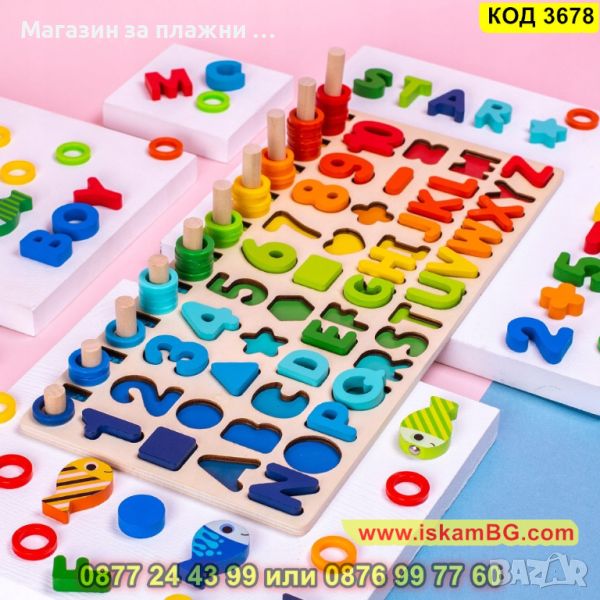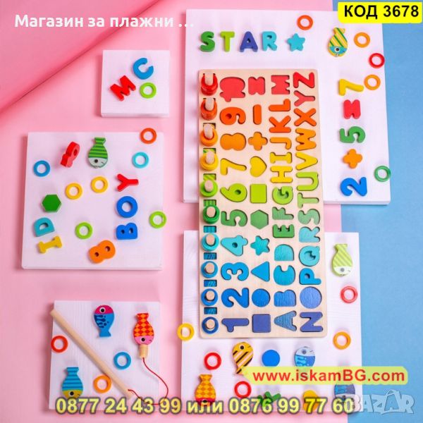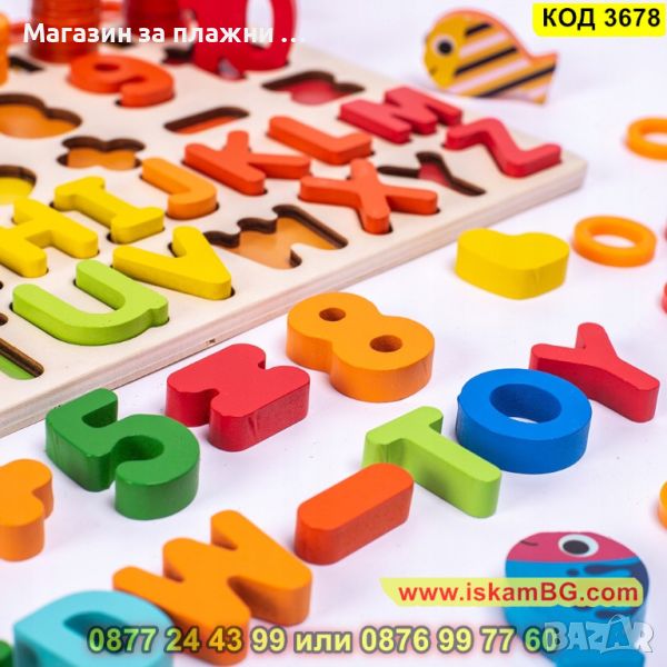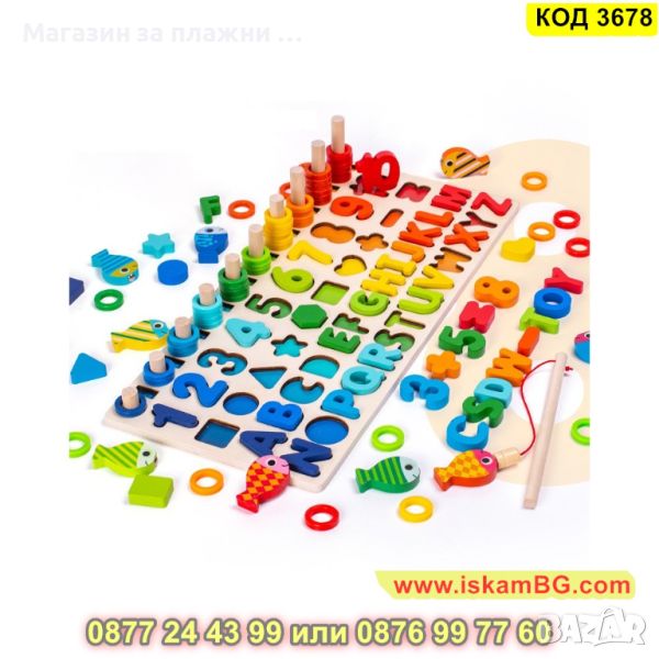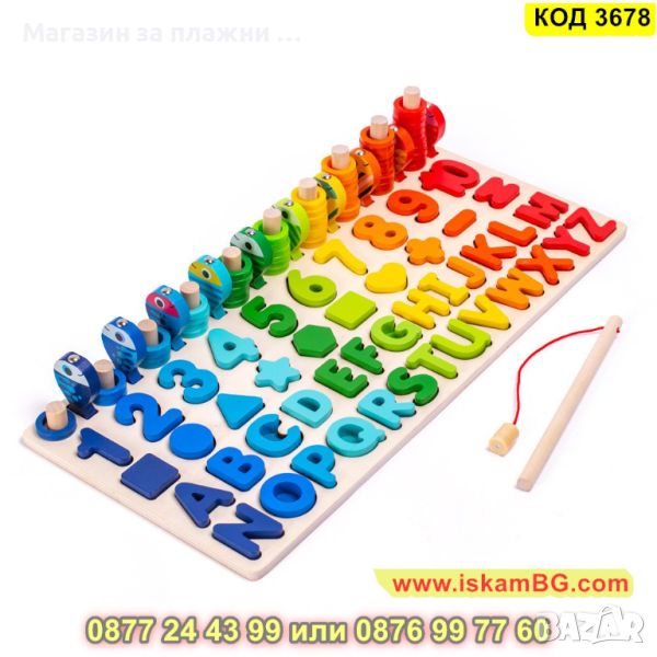 Образователна игра с букви, цифри, форми, рибки и рингове изработена от дърво - КОД 3678