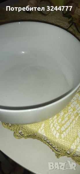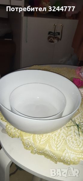 Аркопал. Съдовете на тази фирма се подлагат на термична обработка, което им придава механична устойчивост, както и издръжливост на температурни разлики. Материалът не е порест, затова се почиства лесно и не позволява развитие на микроорганизми. Леки като тегло, подходящи за микровълнова фурна и за съдомиялни машини. По- малката купа е с размери: диаметър 17,5 см и с височина 6,5 см, има 2 леки нащърбвания по ръба, които са снимани- 10 лв. По- голямата е с диаметър 25,5 и с височина 11 см. Има 2 нащърбвания по ръба, които са снимани- 15 лв. Цените са съобразени с повредите.