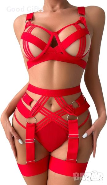 Изработено от еластична материя и копринено мек полиестерен материал. Дамско еротично бельо съставено от 4 части.