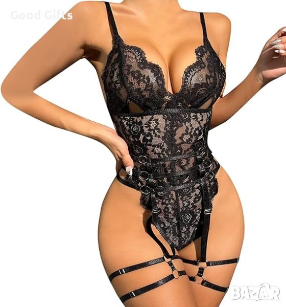 Дамско черно дантелено боди с жартиери без гръб, вълнообразно изрязване, V-образно деколте, прозрачно фетишно и луксозно, безшевно. Ако искате една незабравима нощ с любимия си, този комплект е вашият избор!