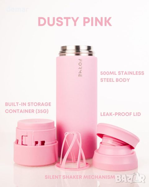Този шейкър може да се похвали с вградено хранилище, което може да побере до 35 g добавки, като се интегрира безпроблемно в основата му за удобство. Изработено от неръждаема стомана, тялото му от 500 ml поддържа температурата на течностите - студени до 12 часа и горещи до 8 часа. Той се отличава с безшумен дизайн, елиминиращ обикновения шум от топката за разбиване и е оборудван с непропусклив капак, за да осигури изживяване без бъркотия. Размерът на шейкъра е оптимизиран за лесно транспортиране, като се побира в джоб на раница, клетка за бутилка на велосипед или всяка стандартна поставка за чаша, а дизайнът му със заоблени ъгли опростява почистването, като предотвратява натрупването на остатъци.