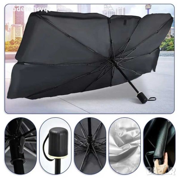 А когато вече нямате нужда от него затворете го и го поставете в кожения калъф. Сенникът защитава от UV лъчите и значително намалява температурата във превозното средство без значение дали е бус, автомобил или камион. Сенникът тип чадър е изработен от необработена коприна и титаново лепило, което слънцето не унищожава като обикновените сенници, дори след излагане на слънце за дълго време, разпъва се като стандартен чадър за дъжд и по същия начин се прибира. Не губете време, а предпазете веднага вашия автомобил!