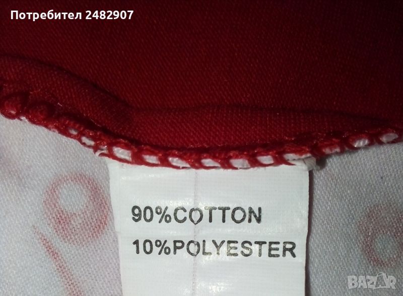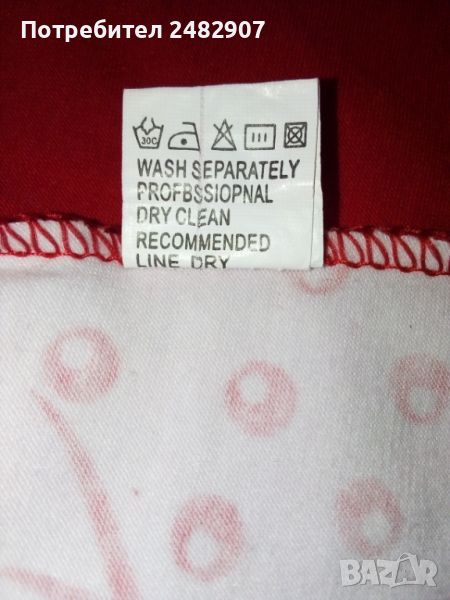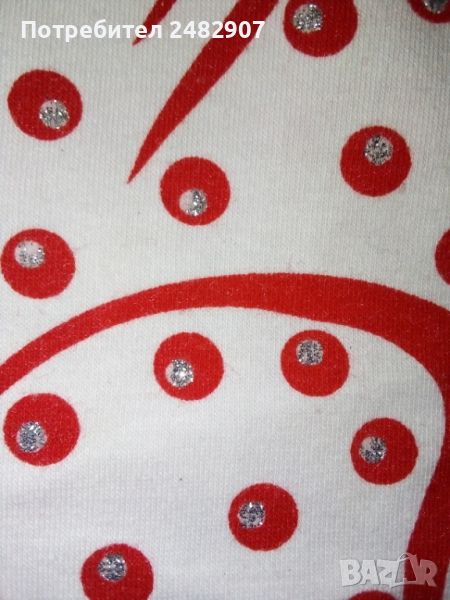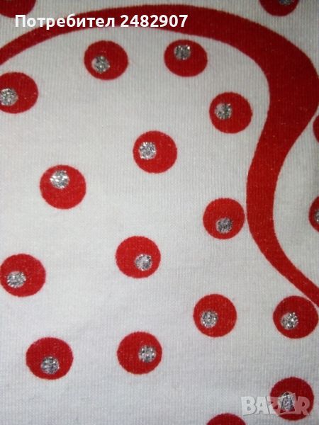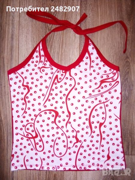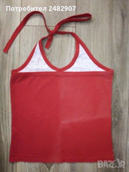 Дамски потник с връзки на врата в бяло и червено. Съдържа 90 % памук и 10 % полиестер. Ширина под мишниците - 36 см, ширина в долната част - 37 см, дължина от под мишниците до долу - 32 см. Обличан е само веднъж, но е със забележка - обезцветяване в дясната част на гърба, видимо от снимките.