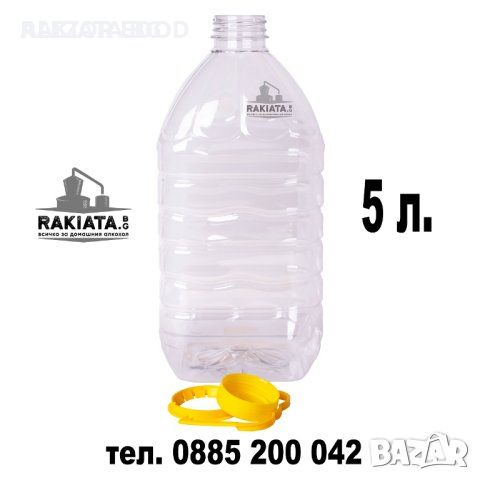 Качествена дебелостенна PET бутилка с вместимост 5 литра за хранителни течности, като вино, ракия, вода, плодови сокове и други. Предлага се в комплект с капачка и дръжка.