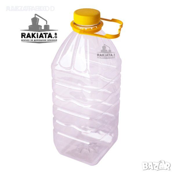 Качествена дебелостенна PET бутилка с вместимост 3 литра за хранителни течности, като вино, ракия, вода, плодови сокове и други. Предлага се в комплект с капачка и дръжка. Описание: