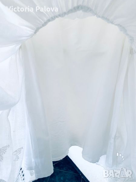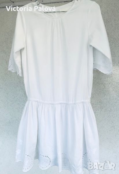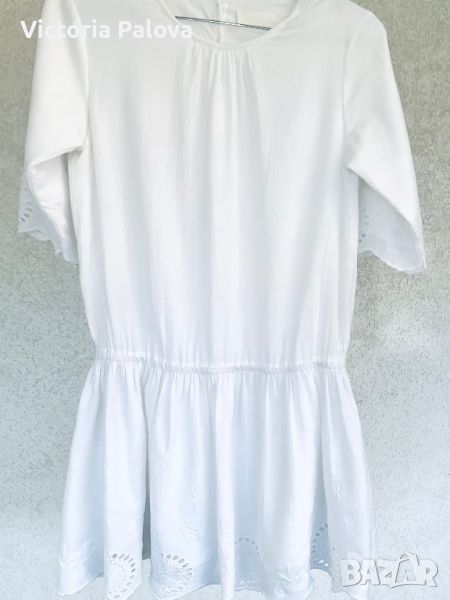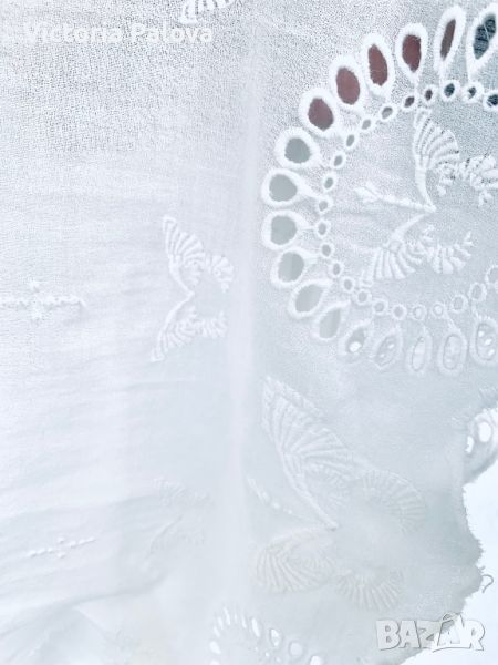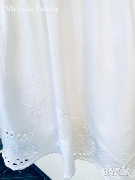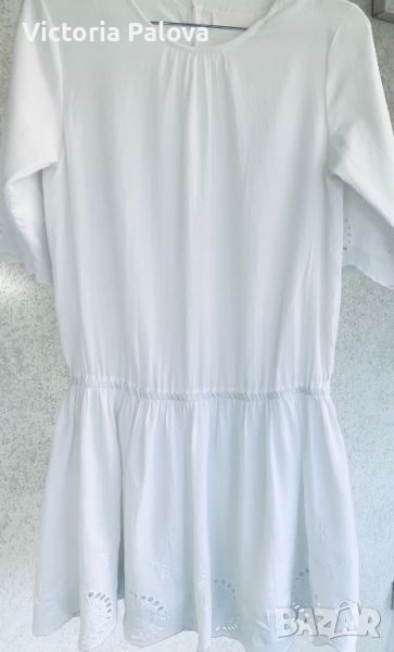 Роклята е разкошна, памук с техника кроше по ръкави и долу - уникална, нежна, красива, удобна ( с подплата - не прозира), с микро копчета на гърба. Рамо - 38 см, ГО - 45см, дължина - 86см, в ластика се разтяга до 50см.