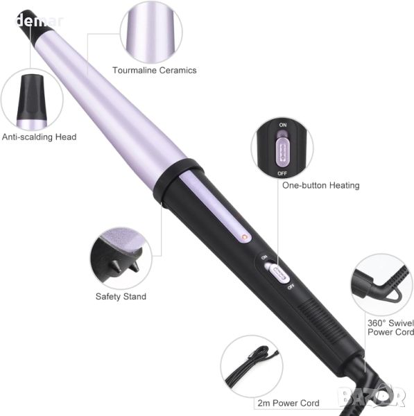 Машата за къдрици JAETON Tapered Wand разполага с конусовидна цилиндър, стесняваща се от 19MM до 32MM, предназначена за създаване както на подскачащи, така и на свободни къдрици без усилие, без гънки. Изработена от керамичен турмалин за гладки, блестящи резултати и намалено къдрене, тази пръчка за къдрене разполага с PTC технология за нагряване за бързо 60-секундно нагряване, идеална за бързо оформяне. Лесен за работа с фиксирана температура от 210°C, той е подходящ за всички типове и дължини на косата, като насърчава равномерното разпределение на топлината и минимизира щетите. Проектиран за безопасност и удобство, той включва съвместимост с двойно напрежение за пътуване по целия свят, топлоустойчива ръкавица, накрайник против изгаряне и въртящ се на 360° кабел. Перфектен спътник при пътуване, той е отличен подарък за близки или удоволствие за вас самите, с леснодостъпна поддръжка за удовлетворение на клиентите.