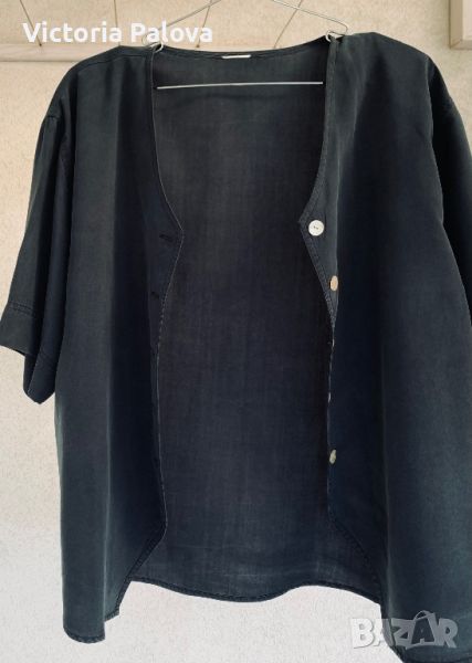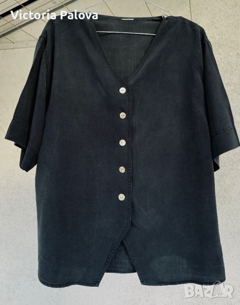 Рядко срещан сиво-зелен цвят, красива риза с дизайнерски трик : V деколтето горе и долу се повтаря обърнато V. Ръкавът е квадратен - широк е 27 см и толкова и дълъг. Рамо - 50см, ГО - 61см, дължина отпред - 63см, отзад - 67см. Европейски размер - 44.