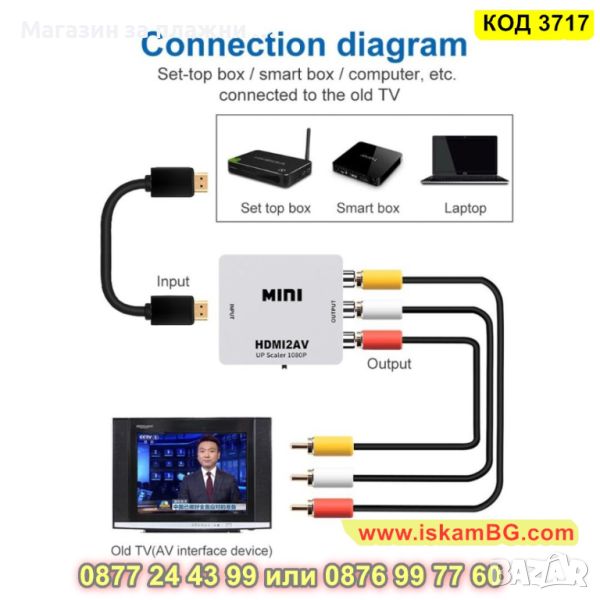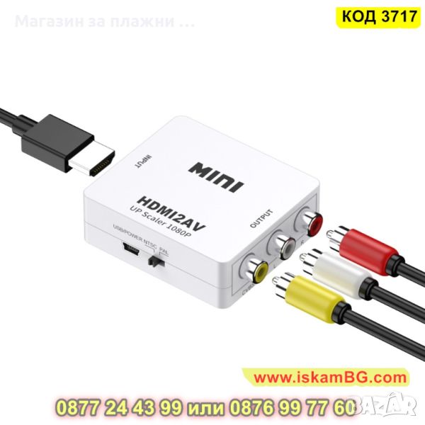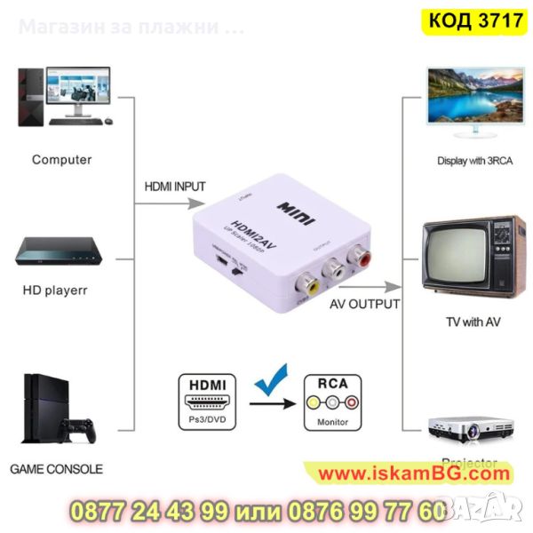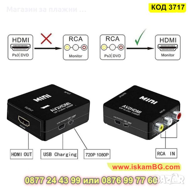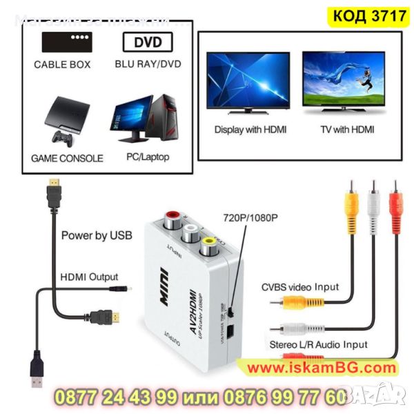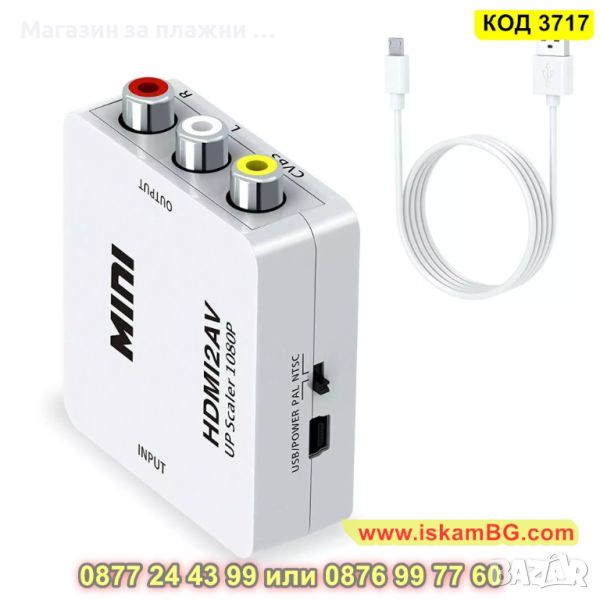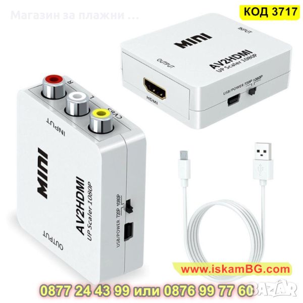 Преходник AV RCA към HDMI подходящ за свързване на устройство с AV изход към телевизор с HDMI вход. Идеята на конвертора е да прехвърля видео и звуков сигнал към HDMI вход, ако устройството няма двоен чини (AV) букси.
