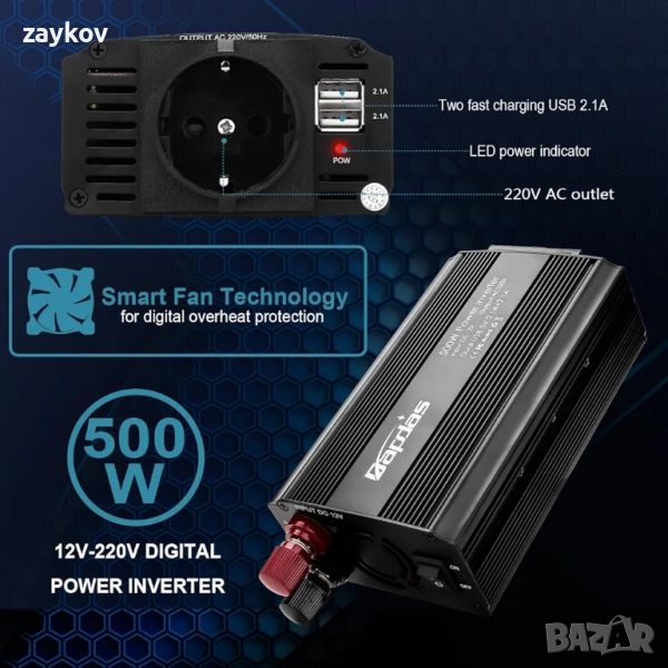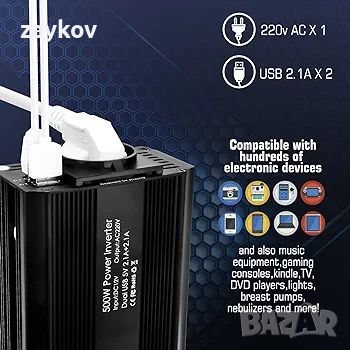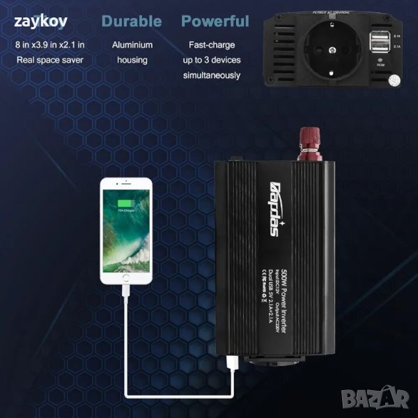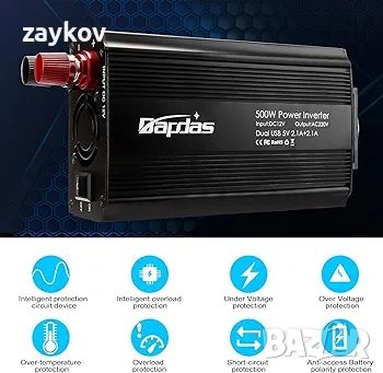Bapdas 500W автомобилен инвертор DC 12V към 220-240V AC, 2 USB порта 4.2A