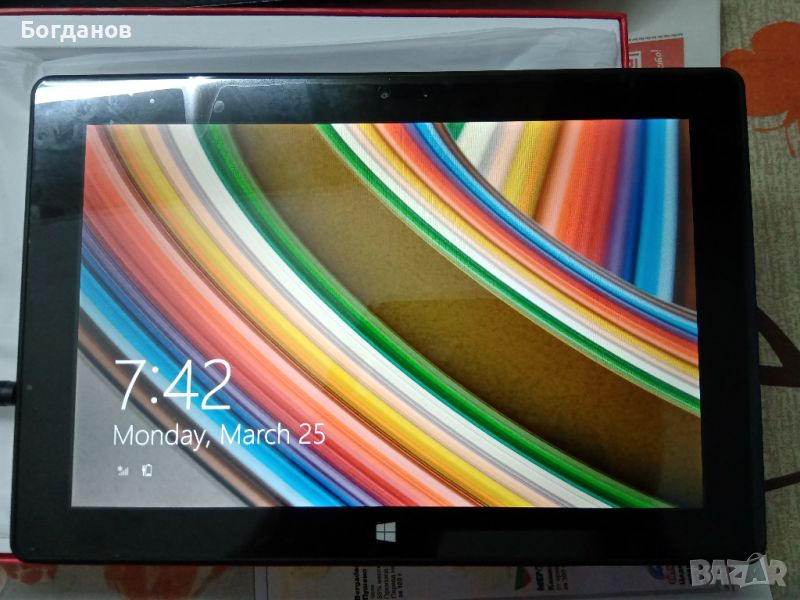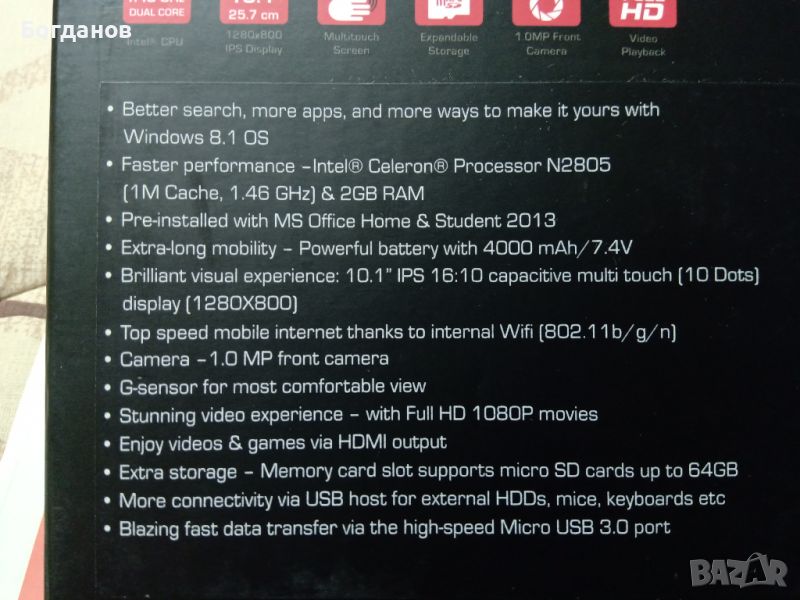 Прочети:Таблета е чисто НОВ,стоял е няколко години в кутията без да е използван и батерията е за смяна,не държи.10.1 инча/25.7 см.На зарядно като се задържи светва работи,но като се изключи зарядното угасва.Отпред и отзад е със оригиналните ФОЛИА.Пълен Комплект-зарядно със български и английски стандарт,Кутия,Книжка.На снимките се виждат параметрите.Реални снимки 100 %