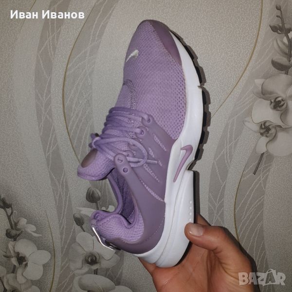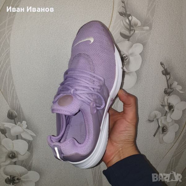 Профил: Спортни ултралеки дамски Nike Air Presto с иновативен дизайн. Цялостната конструкция на обувката с пришит език осигурява комфортно усещане. Обувките са с лилав външен вид и бяла подметка.