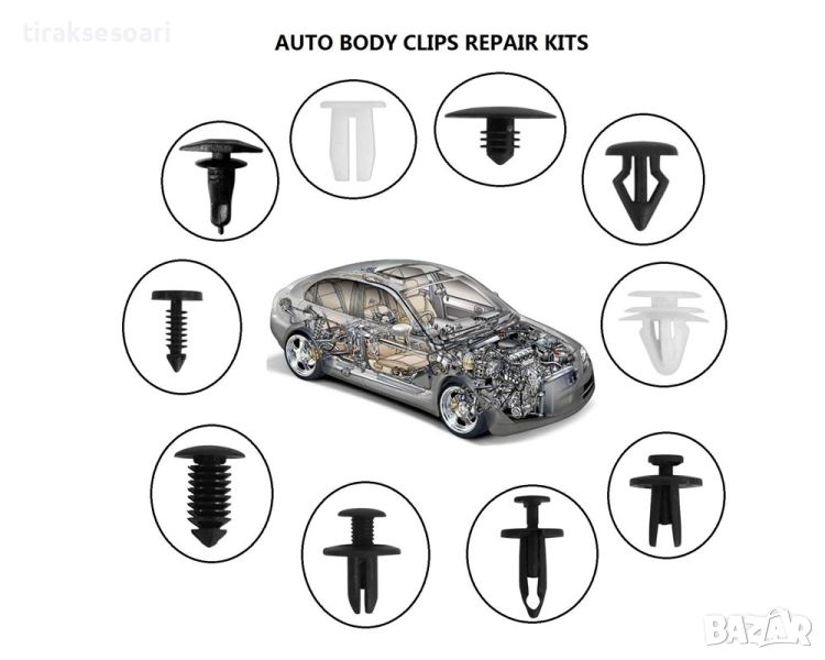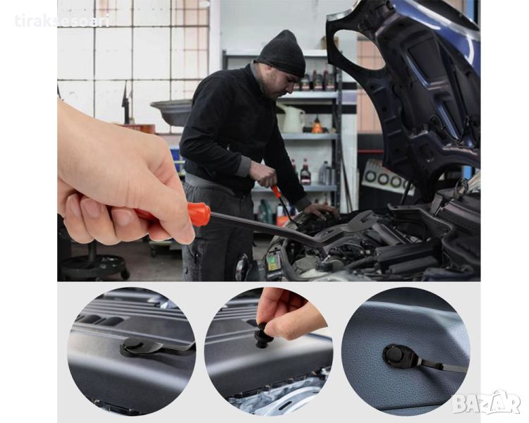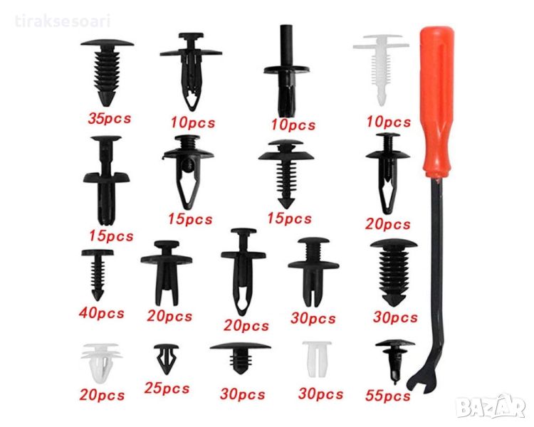 Универален комплект от 421 броя фиксиращи авто клипсове закопчалки копка - щипка за кори лайсни панели табло и др. със инструмент за демонтаж