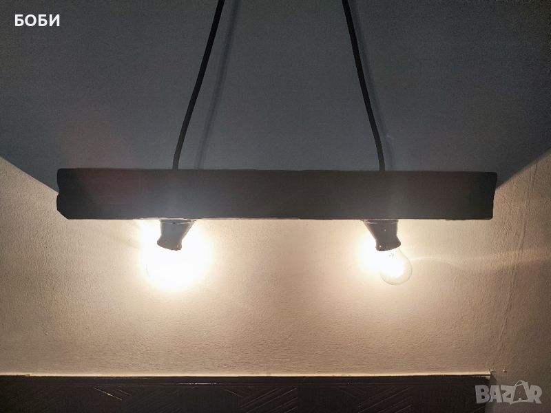 Черен стилен полилей с две крушки Е 27. Дървото е обработено и лакирано, подходящо за всякакъв вид помещения.