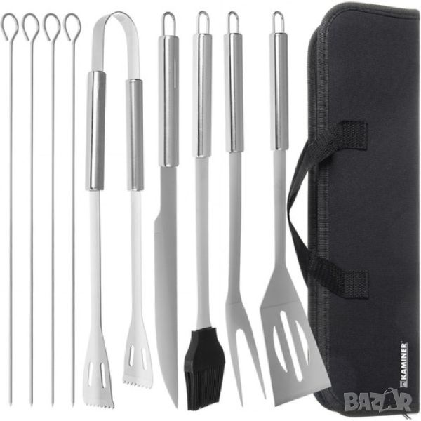 * 9 БР. прибори в комплекта и калъф за съхранение - комплектът от прибори за барбекю включва всичко необходимо за любителско и по-професионално печене на скара. Той включва остър нож, вилица, както и шпатула, четка и щипка. Освен това комплектът включва и 4 шишчета - идеални за приготвяне на вегетариански или месни шишчета.