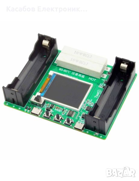 Тестер за капацитет на литиево-йонни батерии с цветен дисплей и USB-C порт за захранване. Модулът може да работи в режим на разреждане, зареждане и цикличен режим на зареждане и разреждане. Той ще работи не само с клетки 18650, но и с всеки друг тип, чието напрежение на разреждане е в диапазона от 2,5 V до 3,5 V и напрежение на зареждане е 4.2V . Платката е оборудвана с 2 USB-C порта , единият е предназначен за захранване на тестера (може да се захранва и от батерия), а другият за разреждане и проверка на капацитета на свързаните устройства. Тестерът показва вътрешното съпротивление на клетката, капацитет, текущо напрежение, текущ ток, текуща мощност, измерен капацитет и енергия, и продължителност на измерването.