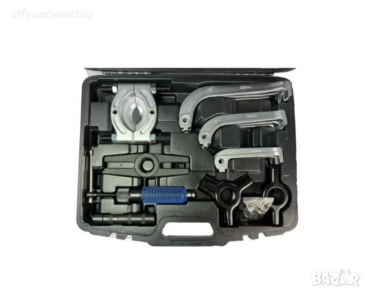 Многофункционален комплект за отстраняване на зъбни колела и лагери. В комплекта са включени сепаратор за лагери и три размера скоби за лагери с три рамена. Подходящ е за широка гама превозни средства.