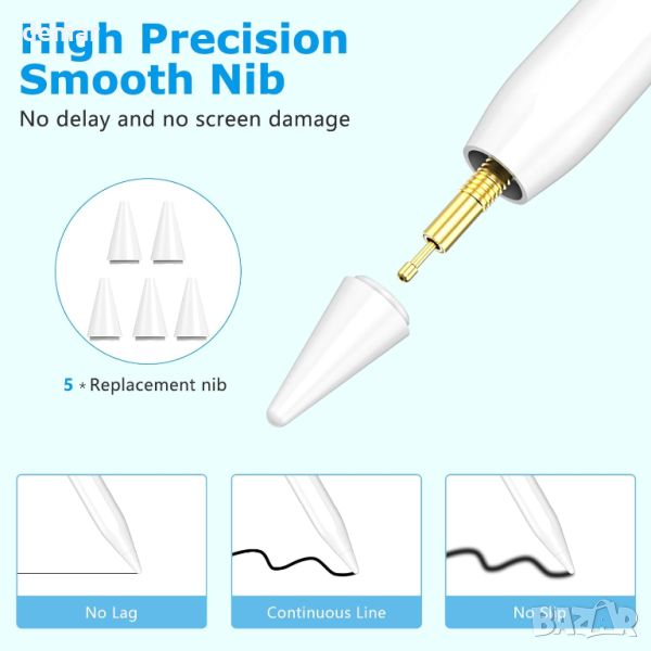 Писалка за iPad, съвместима с iPad модели от 2018 г. нататък, включително iPad 10/9/8/7/6 Gen, iPad Air 3/4/5 Gen, iPad Pro 11 инча 1/2/3/4 Gen, iPad Pro 12,9-инчов 3/4/5/6 Gen, iPad Mini 5/6 Gen. Разполага с технология 2.0 Super Fast Charging, с акумулаторна батерия от 130 mAh, предлагаща 8-10 часа непрекъсната употреба и 180 дни в режим на готовност. Върхът от 1,5 мм осигурява прецизна и гладка работа, идеален за рисуване, скициране, писане и водене на бележки. С 5 сменяеми накрайника Pom и мека поставка за молив от ликра, вашият екран остава защитен. Дизайнът за отхвърляне на дланта позволява естествено изживяване при писане и рисуване, докато магнитната адсорбция поддържа писалката сигурно прикрепена към вашия iPad, когато не се използва. Моля, уверете се в съвместимостта, преди да поръчате.