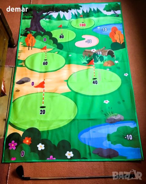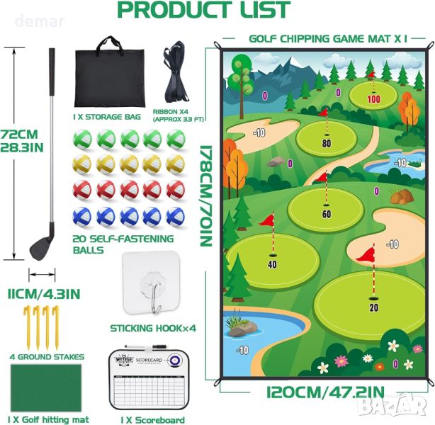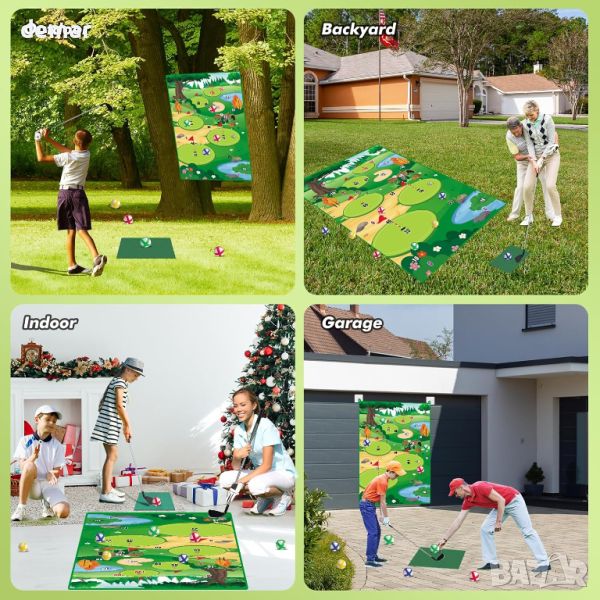 Универсален комплект постелка за голф Chipping, перфектен за семейни забавления на закрито и на открито! Този комплект включва просторна постелка с размери 1,8*1,2 метра, стик за голф, 20 лепкави топки, 4 колчета, въжета, табло за резултати и удобна чанта за съхранение. Насладете се на състезателен геймплей, като се стремите към маркираната зона за отбелязване на точки, като избягвате пясъчни капани и водни препятствия. Висококачествената постелка е издръжлива и може да се пере, подходяща както за вътрешна, така и за външна употреба. Мултифункционалният му дизайн позволява да се използва като голф сцена, постелка за пикник или играчка за игра на хвърляне. Подходящ за играчи от всички възрасти, което го прави идеален подарък за рождени дни или празници. Подобрете вашите голф умения и се забавлявайте с този универсален комплект по всяко време и навсякъде!