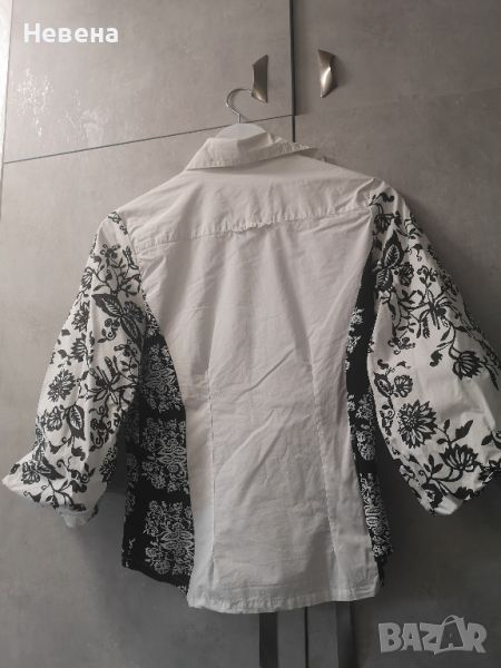 Атрактивна дамска Риза с оригинален дизайн и прекрасни флирални мотиви. Размер L, Отлично състояние. Буфан 7/8 ръкави, вталено. Подходяща за както за официално така и за ежедневно обличане. Стои чудесно с пола, панталон и дори с дънки :) Вискоза, качествена изработка.