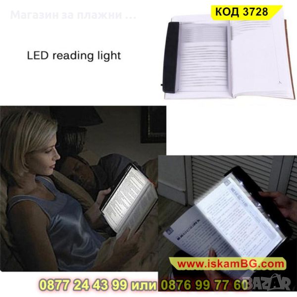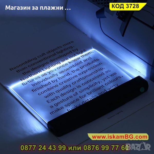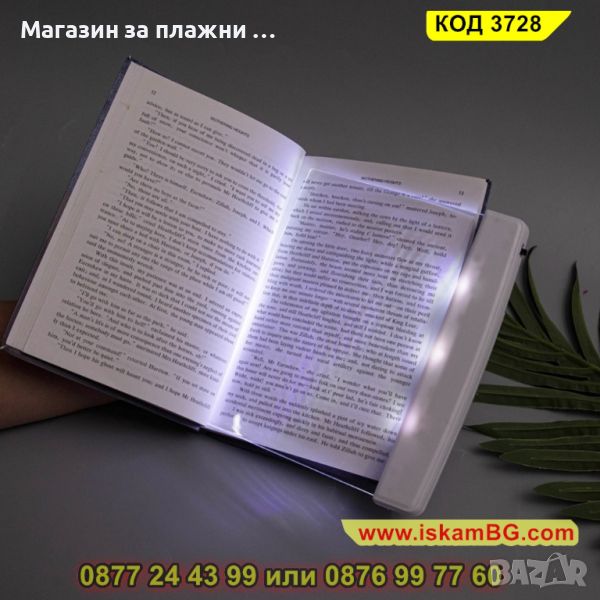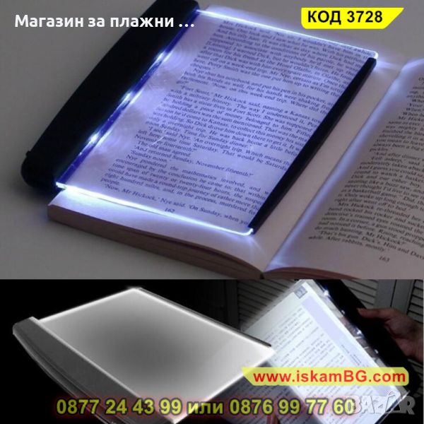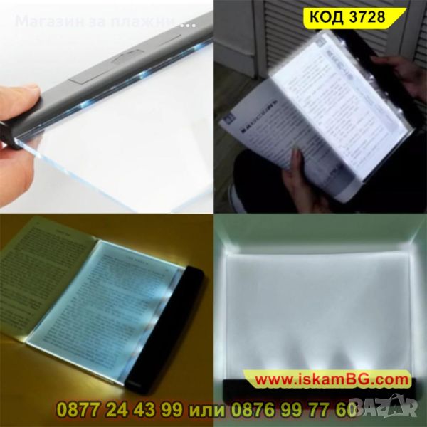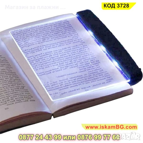 Преносим панел за четене на книги изработен по нова технология, която позволява без да ви натоварва да четете печатни произведения в тъмна стая. Новата LED подсветка предоставя мек лъч върху страница на книгата и не натоварва вас или околните. С този уред може да четете с часове без да чувствате умора или да пречите на околните.