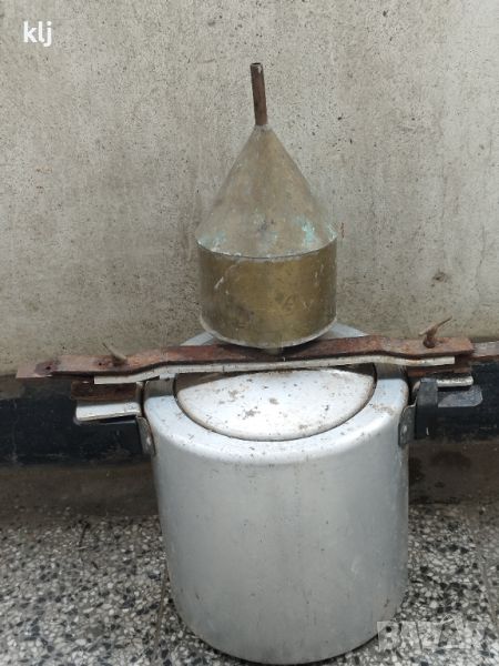Тенджера под налягане пригодена за варене на ракия, тенджерата е от старите от дебел алуминий,подсилена с железни пластини,става за електрически котлон и газов