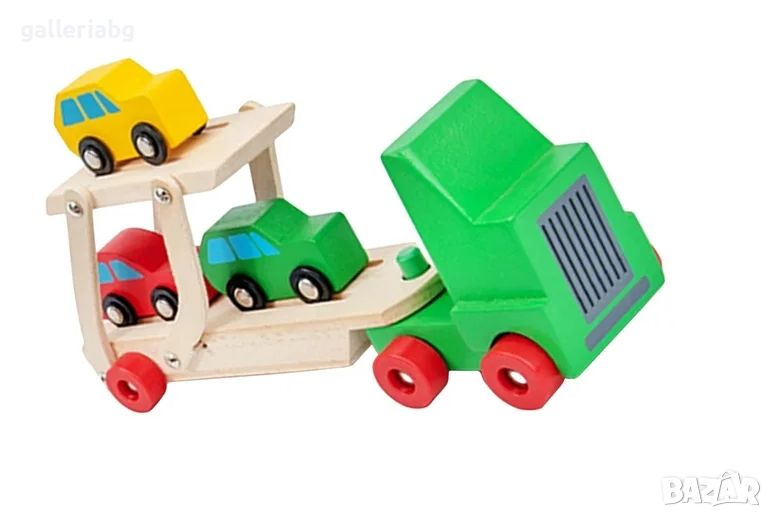 Комплект дървен камион с транспортна платформа и 3 колички.
