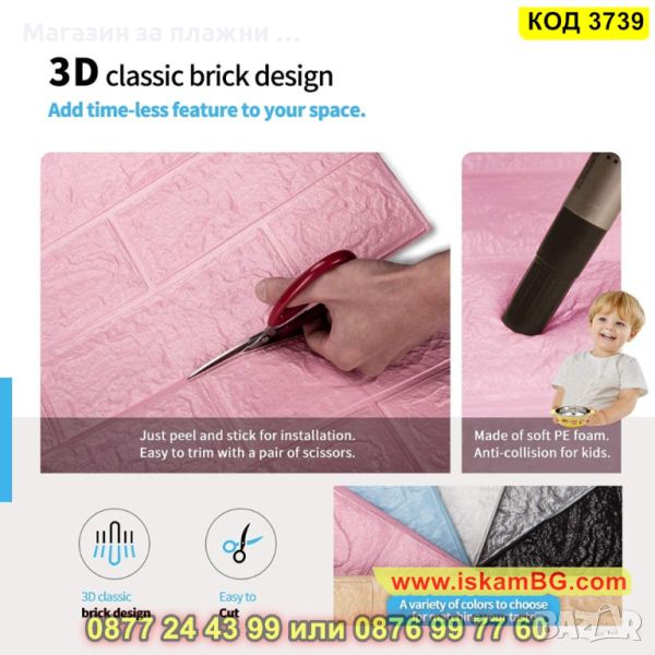 Красиви и стилни 3Д стенните панели се използват успешно от много хора за декорация на интериора в офиса или дома. Те се самозалепват за всякакъв вид повърхности и са направени от мемори пяна. Освен това имат PVC покритие, което е устойчиво на механични натоварвания и слънчева светлина. Тези красиви 3д лилави тапети са напълно безопасни за здравето, не се влияят от влагата, а поддържането им е лесно. Самозалепващите се 3д са подходящи, както за кухня, така и за баня, като не изискват за монтирането си идеално гладка повърхност – точно обратното е, можете да ги ползвате, ако искате да скриете неравности и дефекти по стените Ви! 3Д стенните панели се са щамповани с форми за декоративни тухли, което ги прави да изглеждат напълно реалистична. Позволяват декорацията на различни части от дома Ви - таван, балкон,кухня, всекидневна, коридор, баня, антре.