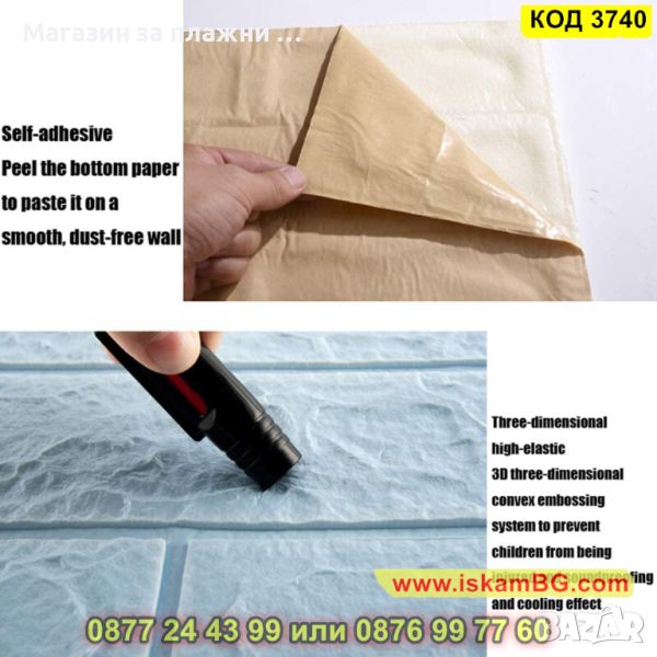 Страхотен избор, ако сте решили да обновите някоя част от дома, вилата или офиса си! Не ви е необходимо лепило дори, а само да изчистите старателно повърхността, където ще лепите и да я изсушите, след което трябва да извиете назад част от защитния слой от ръба на синия панел преди монтажа и да залепите 3D панела, като постепенно отстранявате защитното фолио. Това отнема максимално 30 минути. Стилните самозалепващи 3D тапети са подходящи за всякакви повърхности: дърво, бетон,стъкло, гипскартон, метал.