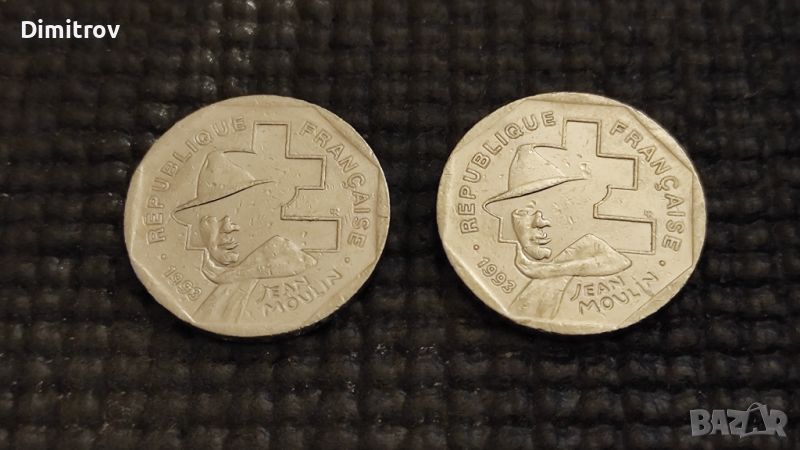 Юбилейни 2 франка, отсечени по повод 50 години от националното съпротивително движение на Франция. На монетата е изобразен Жан Мулен - лидер на Съпротивата, заловен и убит от Гестапо.