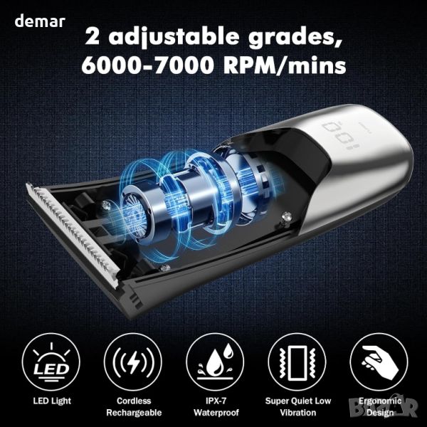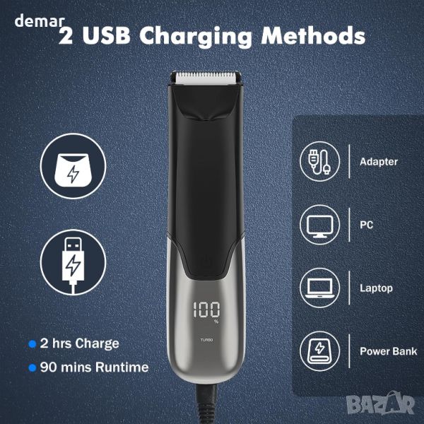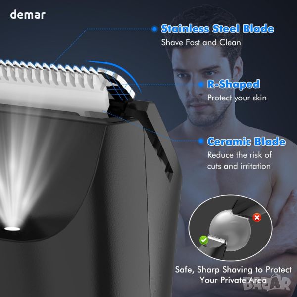 Този мъжки тример за срамни косми предлага безопасно и ефикасно изживяване при подстригване, включващ R-ъгълни керамични остриета за поставяне на карти за хигиена и острота, което го прави идеален за интимни зони, както и за слабините, гърдите, подмишниците, гърба, краката и др. Това е отличен избор за подарък за мъже. С литиево-йонна батерия от 800 mAh, той осигурява 90 минути употреба и включва USB докинг станция за зареждане, идеална за използване у дома или в движение. Вградената LED светлина осигурява прецизност при условия на слаба светлина. Неговият рейтинг на водоустойчивост IPX7 позволява мокра и суха употреба, а тримерът се почиства лесно с подвижна бръснеща глава. Той предлага гладко бръснене с регулируем гребен за 3 различни дължини (3 mm/7 mm/10 mm) и разполага с безопасни керамични остриета за комфортно изживяване при поддържане. Интуитивният LCD дисплей показва живота на батерията и състоянието на заключване при пътуване, повишавайки удобството и безопасността.