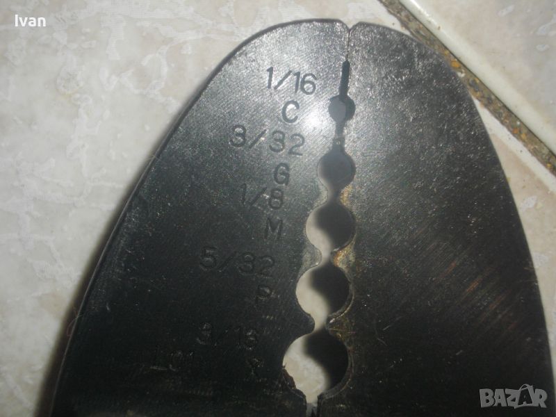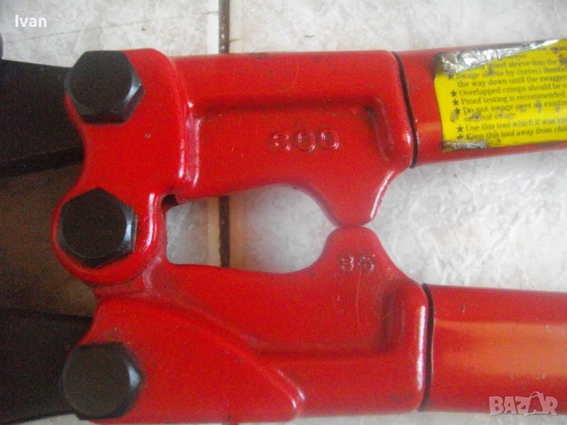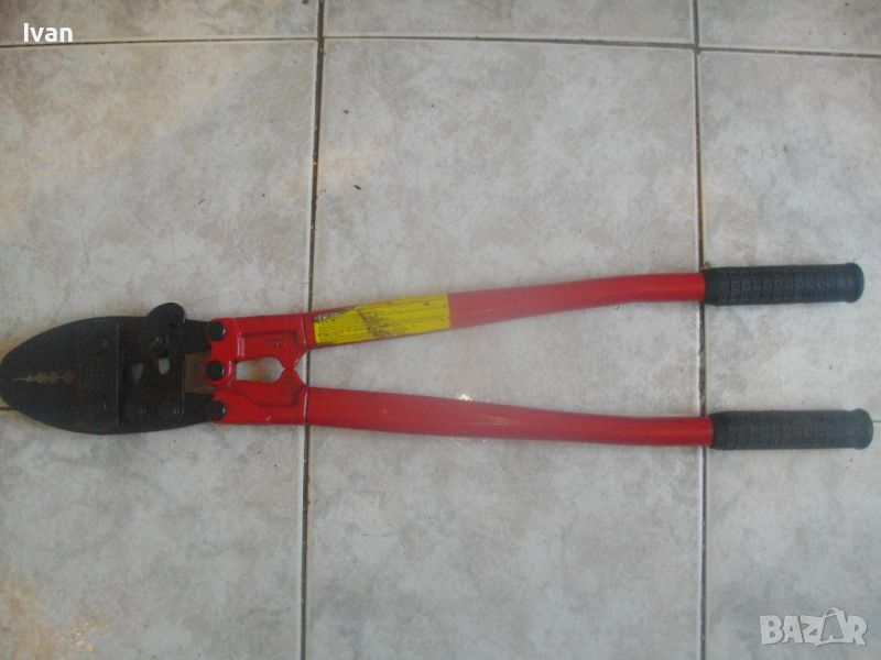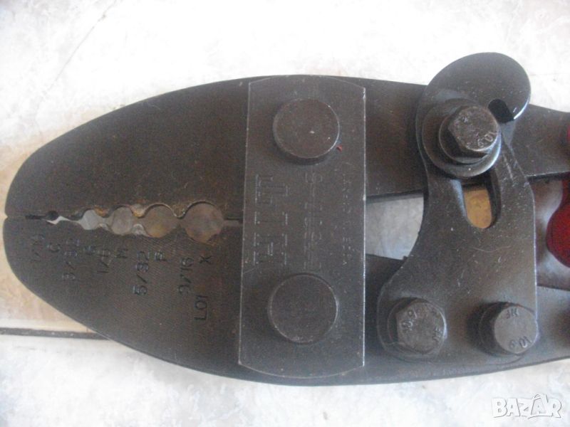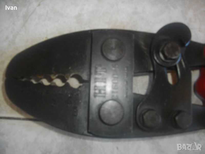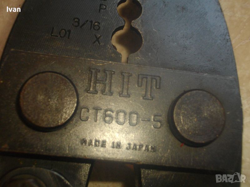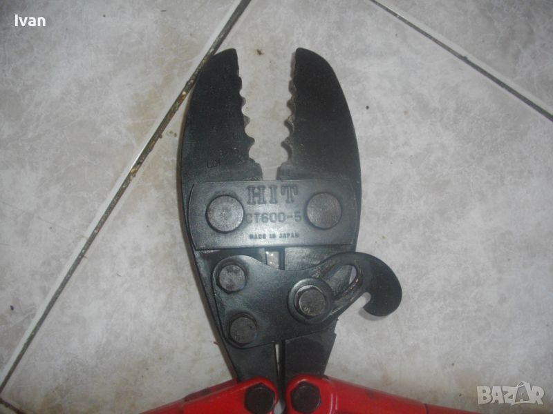 ОПИСАНИЕ на кримпваща кабели японска ножица. Съвсем нова, неизползвана и неупотребявана. Ползвани ножици от модела се продават в световни сайтове на средна цена 250 долара. Марка и модел на ножицата - HIT CT600. Маркирана за оригинално японско производство - Made in JAPAN. Кримпва в 5 различни размера кабели: 1/16, 3/32, 1/8, 5/32, L 01 X. Главата е от закалена индустриална лугитирана стомана. Дължина на инструмента - 66,5 см. Отваряне на челюстите до 20 мм. Гумирани покрития на дръжките. Тегло на ножицата - 3,0 кг.