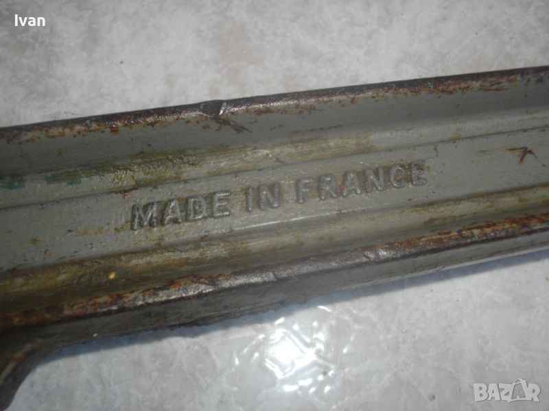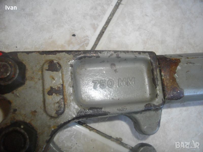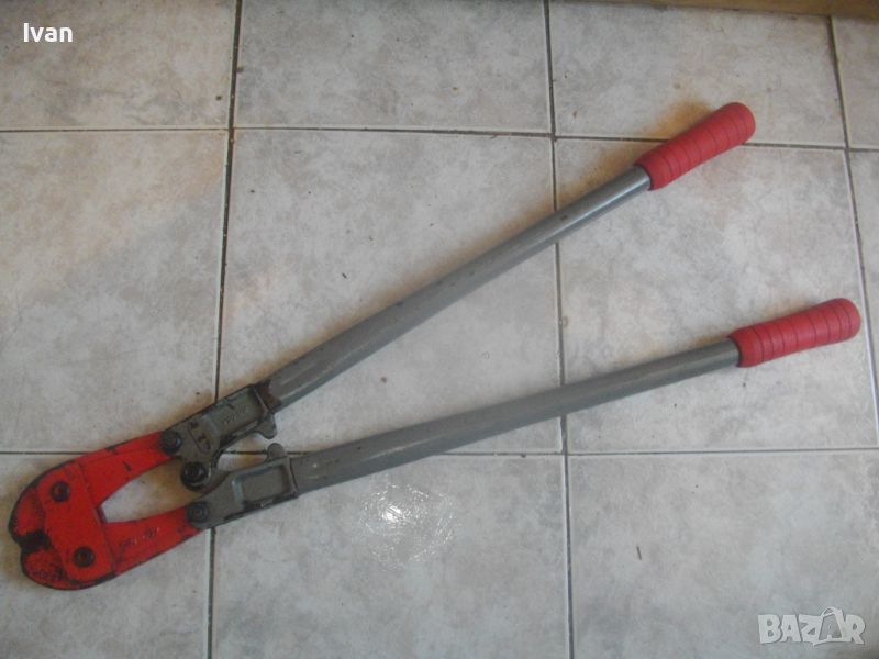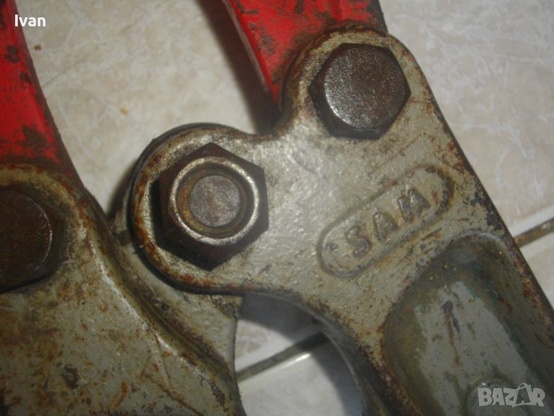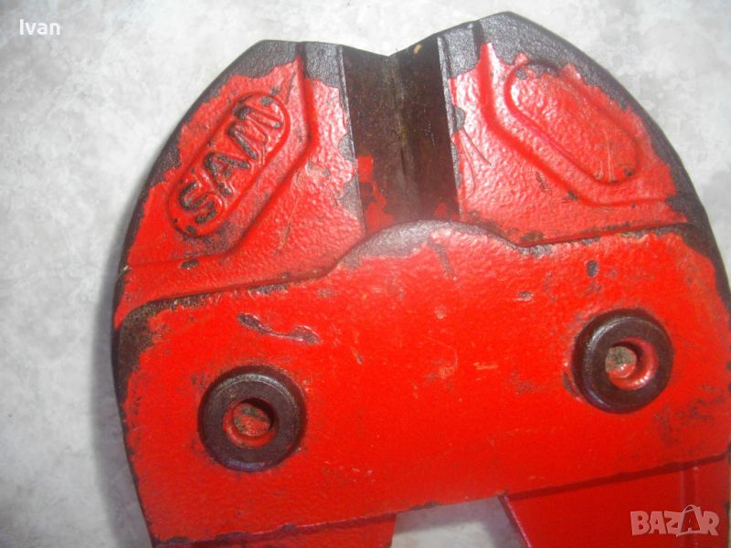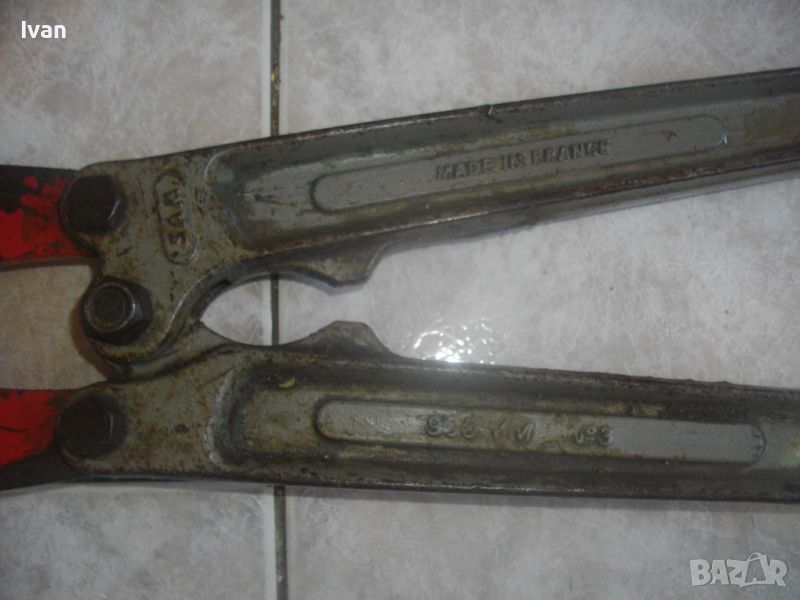ОПИСАНИЕ на голяма френска ножица. Цена 199 лв. Професионална. Марка и модел/вписани маркировки - SAM 900 №3- Made in FRANCE - ACIER STEEL. Масивна, колоритна. Дължина 900 мм. Червени меки пластмасови покрития на дръжките. Дръжки -масивна стомана тръби. Челюсти - леко захабяване и наранявания, но ножицита реже бързо и добре дебела арматура. Отваряне челюсти до 12 мм. Тегло на ножицата - 6,5 кг.