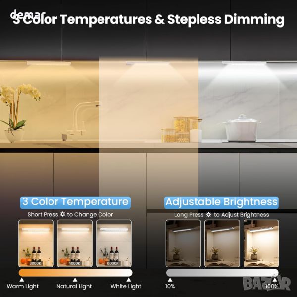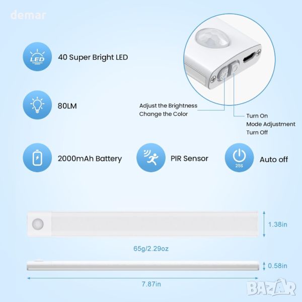 Опаковка от 4 кухненски лампи под шкафа, с размер 20 см и 40 LED крушки. С мощна батерия от 2000 mAh, тези светлини предлагат удобна функционалност на сензора за движение за използване на закрито. Те са оборудвани с вградени силни магнити за лесно закрепване към железни повърхности и магнитни ленти за гъвкаво поставяне на стълби, шкафове или спални. Светлините са USB-C акумулаторни и могат да се използват като ръчни лампи за преносимо осветление, когато е необходимо.