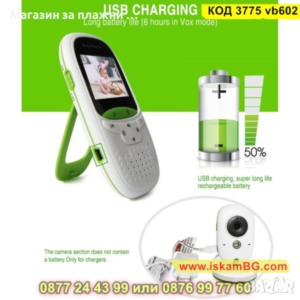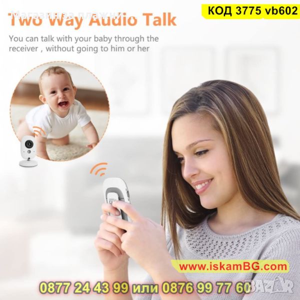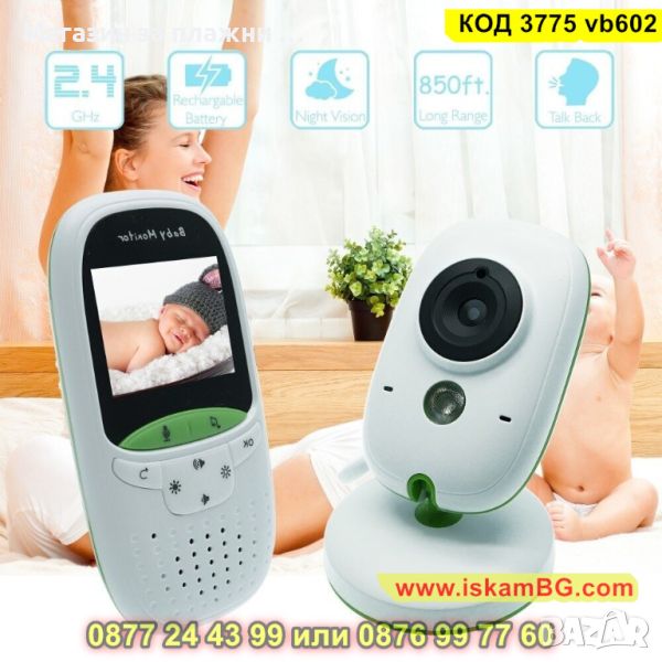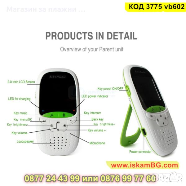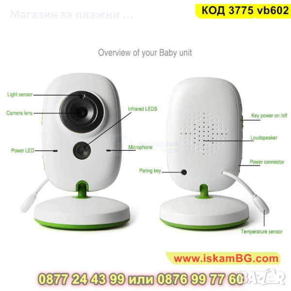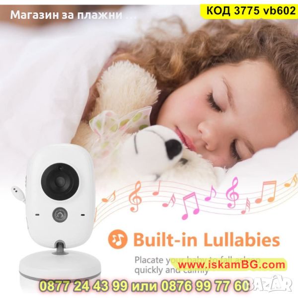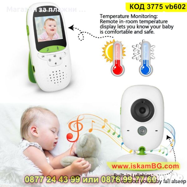 Видео бебефона е многофункционално съвременно устройство, което улеснява грижите за родителите на деца от всички възрасти. Вградената температурна сонда ще гарантира, че бебето ви не е с твърде ниска или твърде висока температура. Функцията за възпроизвеждане на приспивни песни ще ви помогне да успокоите плачещия си малчуган или да го разсеете за времето, когато не сте там. Занимавайте се с ежедневните си задължения със спокойствие, знаейки, че с електронната бавачка имате пълен контрол върху безопасността на вашето малко дете!