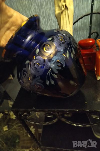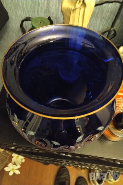 Великолепна ръчно изработена и рисувана ваза на Бохемия с позлата син кристал средна плътност .Висока 20 см диаметър отвор 25 см вместимост около 2 литра .Забележки леки по гърлото ( позлатата и чипчета ) не се забелязват вижте снимките .Цветята не се продават .