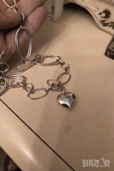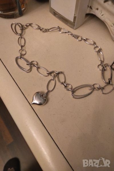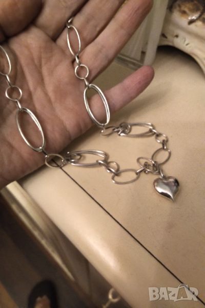 Сребро 925 ( маркирано ) елегантно дамско колие със сърце .Дължина 48 см сърцето с окачването 5 см ,елементите не могат да се отварят .Изглежда обемно и елегантно без да натежава .Носено е изключително рядко ,като ново .Крайна цена ,бартери не ме интересуват