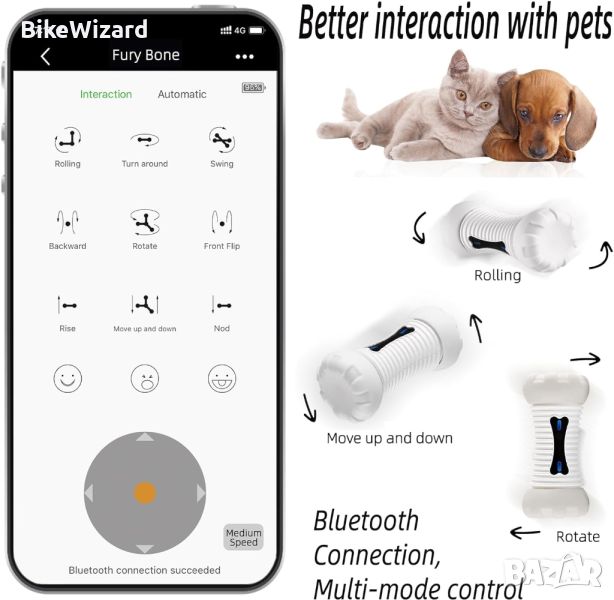 Свържете Fury Bone чрез Bluetooth, можете да го управлявате ръчно. Могат да бъдат избрани 9 типа начина на движение, за да позволите на вашите домашни любимци да гонят с помощта на витуален джойстик. Автоматичен режим на игра, програмиран до 60 минути, за да привлече вашите вниманието на кучето и не изисква ръчно управление.В режим на ръчно възпроизвеждане има 3 вида емоционални състояния, които можете да изберете, за да взаимодействате по-добре с вашите домашни любимци. Те носят различни преживявания на домашните любимци с регулиране на различни дейности, които се основават на поведението на вашите домашни любимци.
