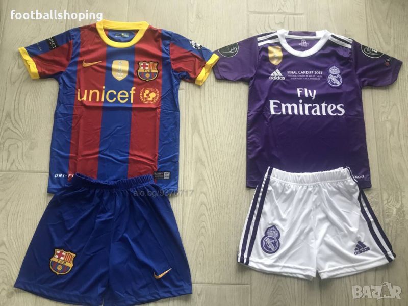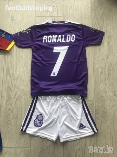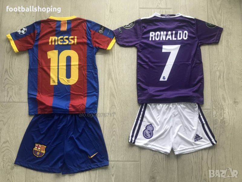 Предлагаме детски футболни екипи на Барса с Меси 10 и Реал М с Роналдо 7. Материя: Полиестер лукс!!! Размери от 104 до 176 номер. Топ качество на изработка