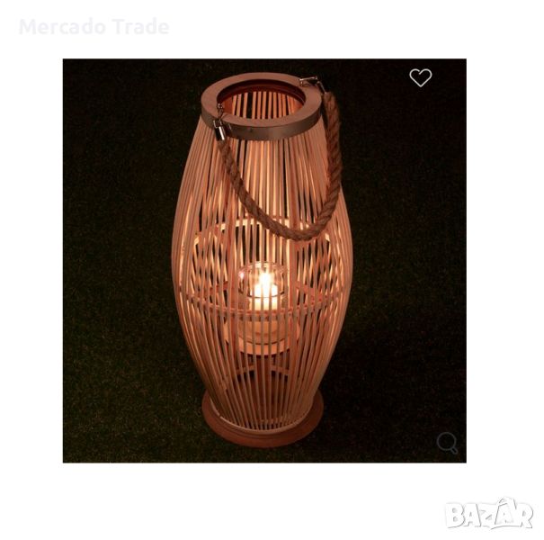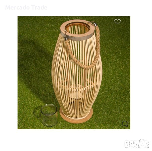 Декоративен фенер Mercado Trade за декорация с дървена рамка и вертикално успоредни тънки камъчета в рус цвят.