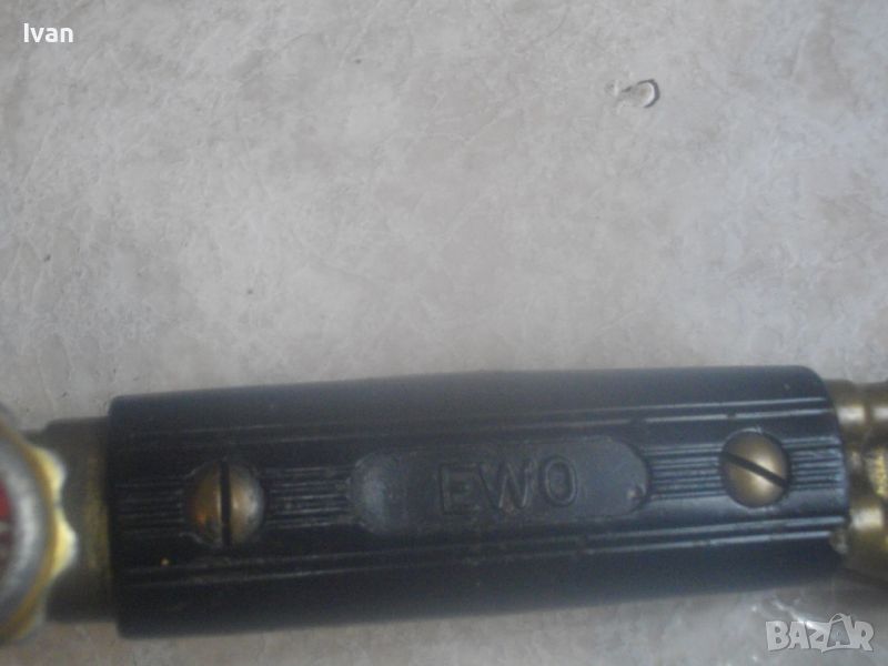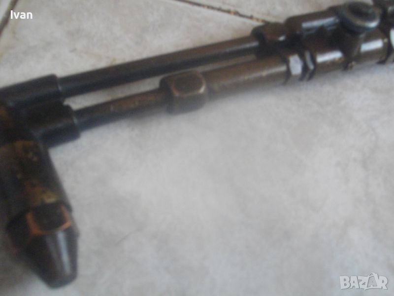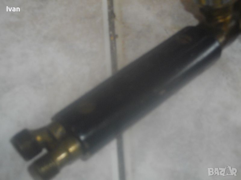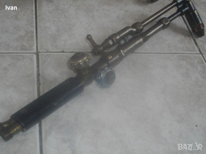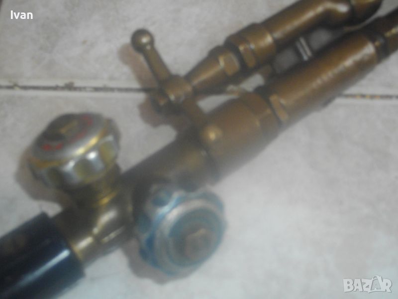 ОПИСАНИЕ на резак 53 см - 199 лв. Старо качество. Дължина 53 см. Ползван, в отлично състояние. Производство маркирано 1996 г. Номер 47229. Немски. Бронзов изцяло, 2 въртока спирателни кранове алуминиеви, рамо бронз, контактна дюза медна голяма 9-14 мм, с дължина 7 см и 1 дупка за пламъка. Тегло на резака - 0,5 кг
