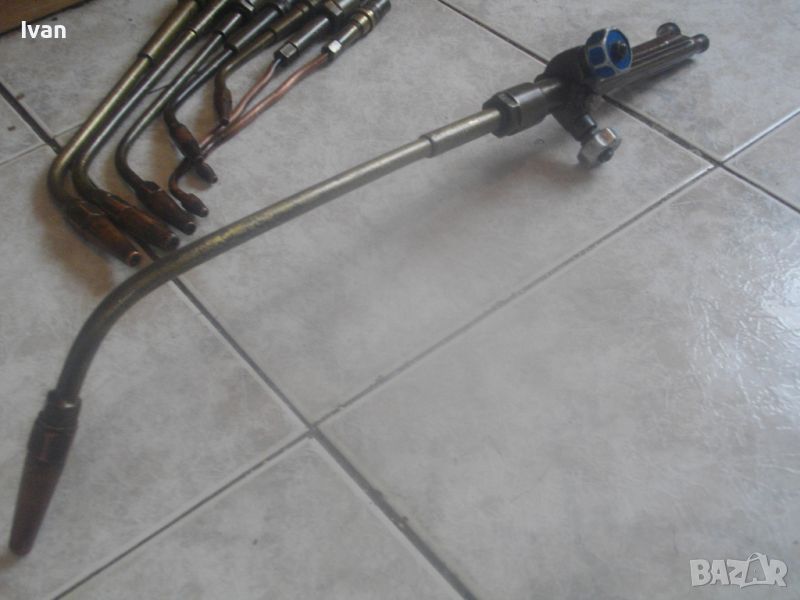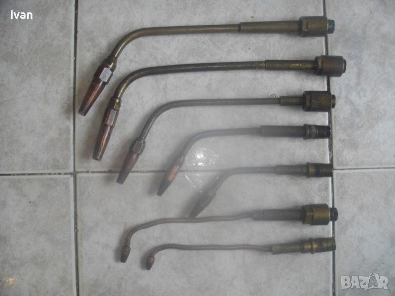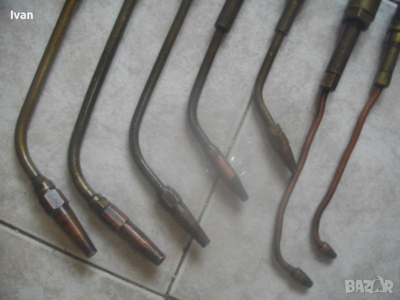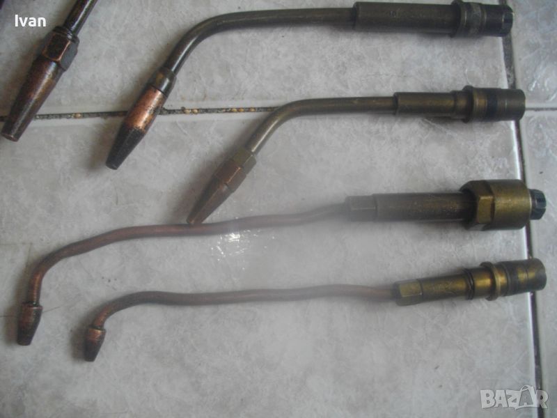 ОПИСАНИЕ на рамена с контактни дюзи за гореелка/резак - цена по споразумение от 339 лв нагоре за 1 бр. Ползвани, в отлично състояние. Старо професионално немско качество. Различни големини дюза, различни номера, различна дължина рамо от 17 см до 2 см, различно налягане барове на рамото. Материал - броонз и мед. Общо тегло на всичките 7 рамена с дюзи - 2,0 кг.