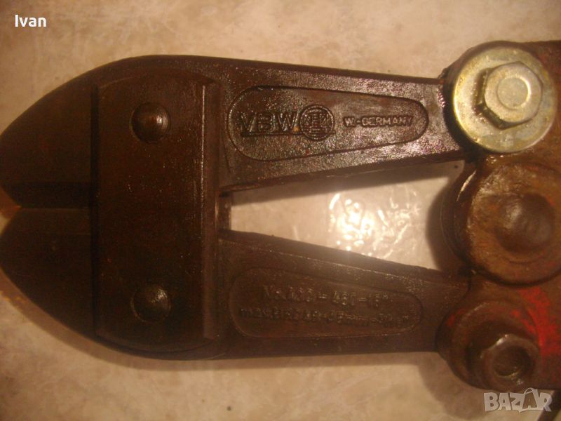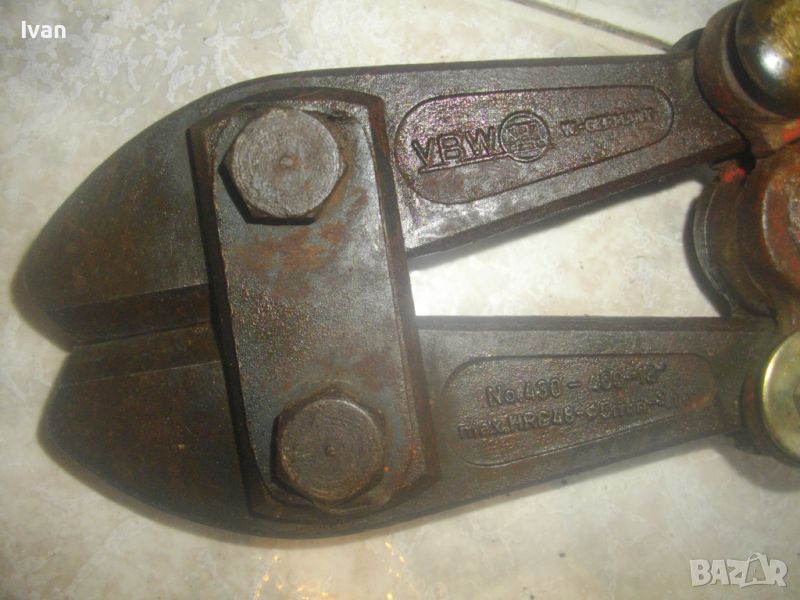 Цена на ползвана професионална ножица за рязане на арматура - немска - старо качество - Зап.Германия - VBW №435 - W.Germany - хром-ванадиум - 820 мм - 5,0 кг - цена 199 лв. Малко ползвана, в отлично състояние. Дръжки тръби ф 30 мм, челюсти отлични без наранявания, отваря до 12 мм. Материал - CHROM-VANADIUM. Дължина на ножицата - 82 см. Цена 199 лв. Тегло - 5,0 кг.