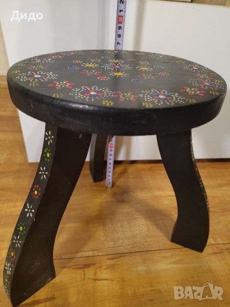 Ретро дървена ръчно рисувана, трикрака помощна масичка. Запазена за времето си. Идеален предмет за декорация или колекция.
